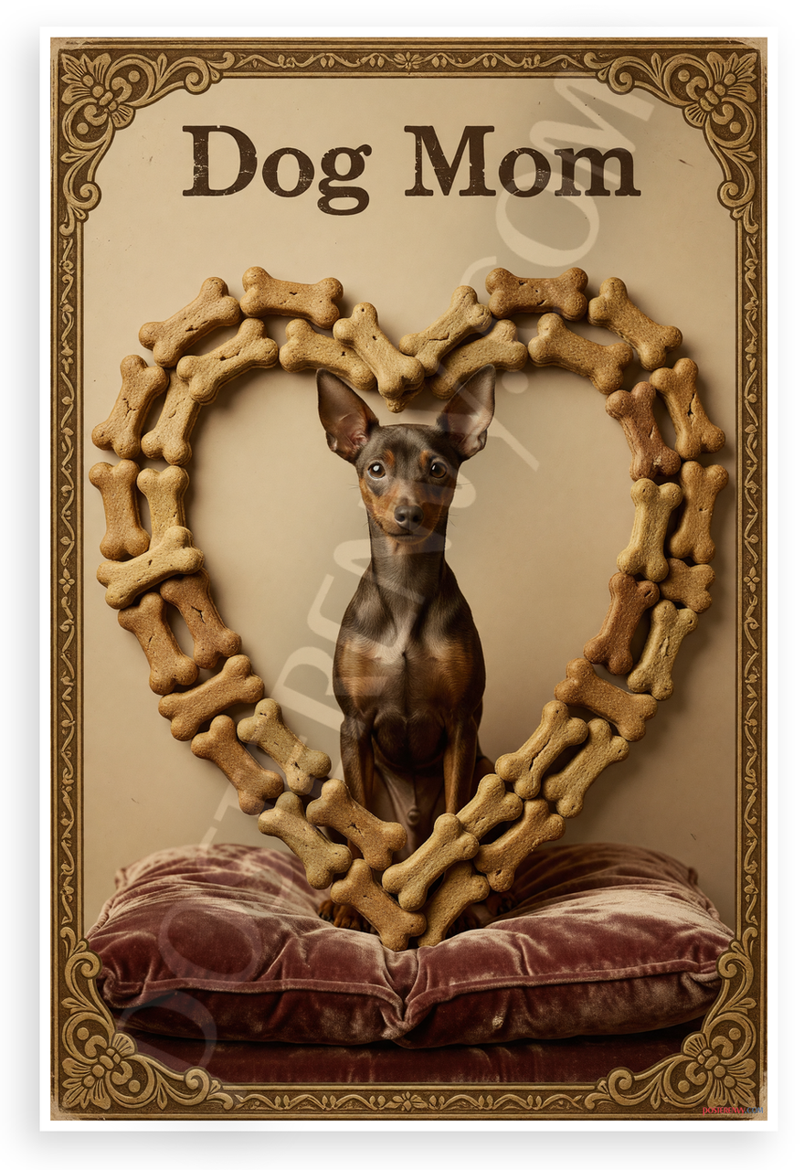 - Vintage Dog Mom Charm: Adorable Miniature Pinscher centered in heart-shaped dog bone treats on velvet pillow, evoking warmth and nostalgia in sepia tones with elegant retro frame. Ideal for kitchens, living rooms, pet rooms or nurseries