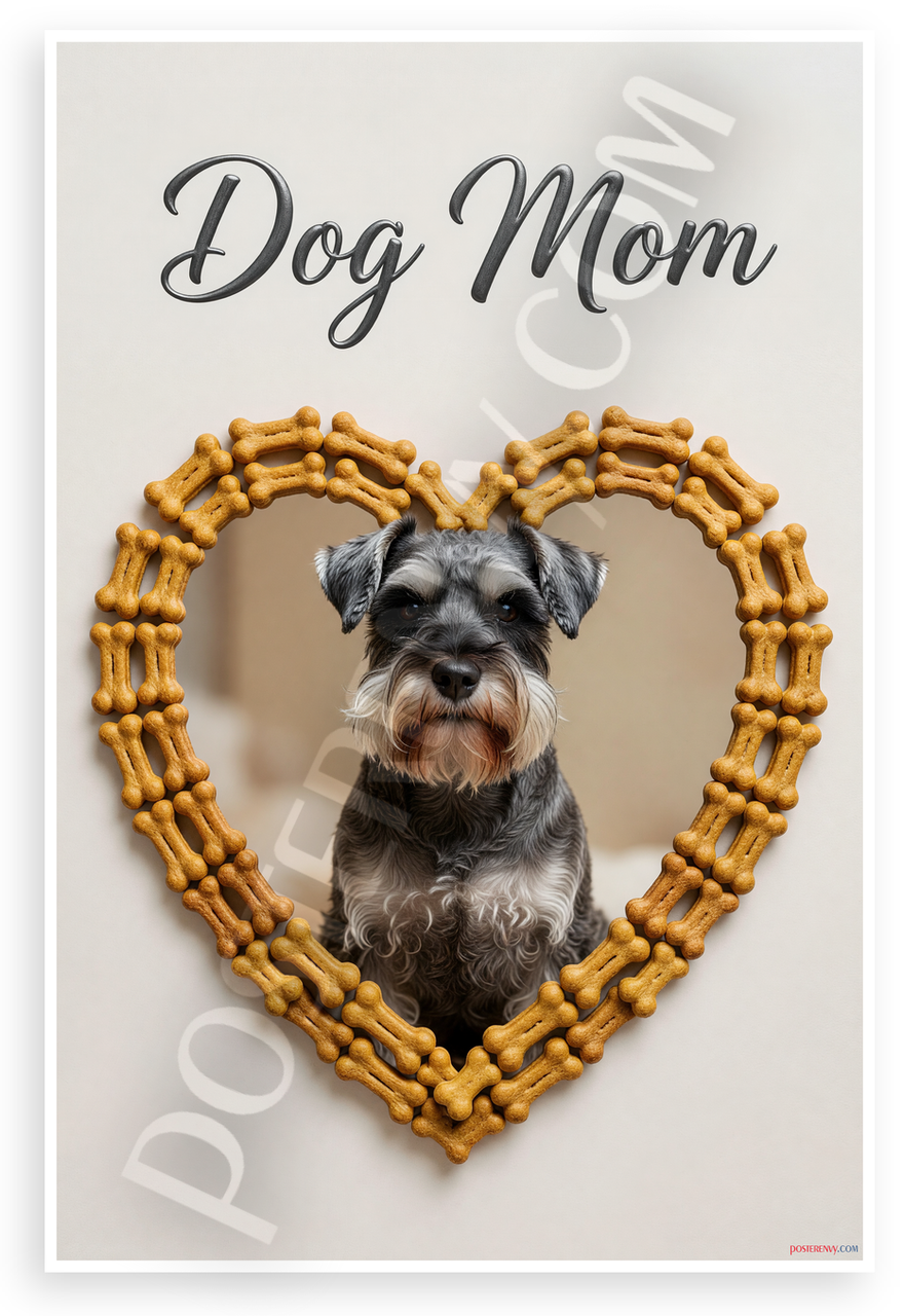 - Heartwarming Dog Design: Adorable Miniature Schnauzer gazes from a golden dog bone heart frame against soft beige background, elegant Dog Mom typography creates serene, loving mood. Perfect for kitchens, living rooms, pet rooms