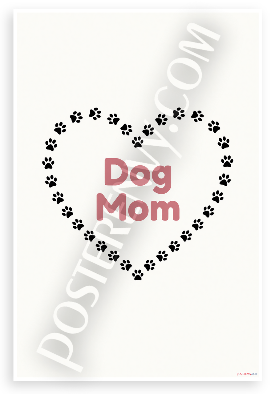 This 12x18 inch poster is printed on premium, durable paper. Proudly Made in the USA by PosterEnvy. The perfect size for any room. PosterEnvy is a family owned business, delivering top-notch posters around the world for over 20 years. Our posters are designed to last — they won't fade or pucker for years of enjoyment. Every poster features crisp, vivid artwork. We are a solar powered company. Celebrate pet love with this minimalist heart design formed by black paw prints surrounding bold pink Dog Mom text on a clean white background, evoking tender affection for dog owners.