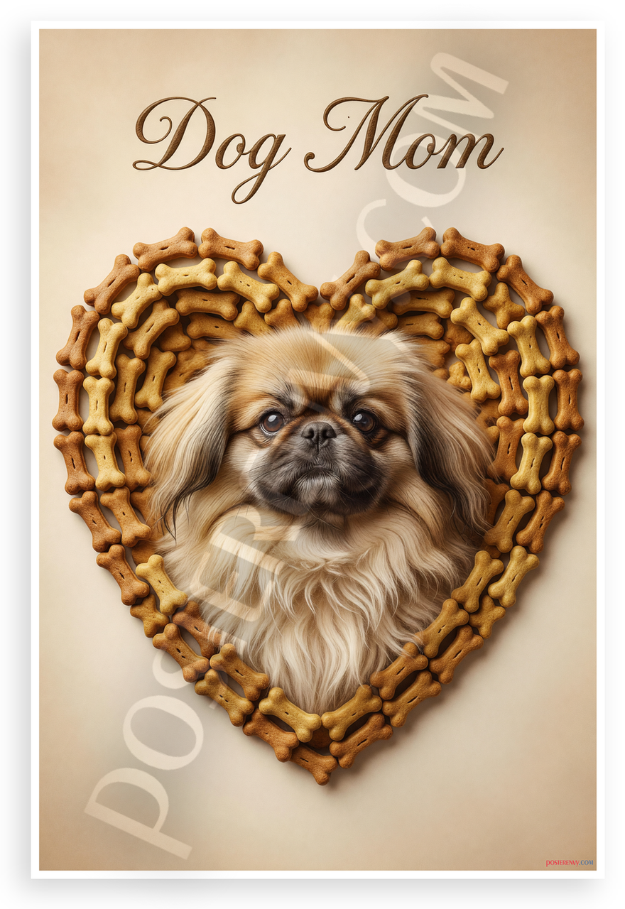 This 12x18 inch poster is printed on premium, durable paper. Proudly Made in the USA by PosterEnvy. The perfect size for any room. PosterEnvy is a family owned business, delivering top-notch posters around the world for over 20 years. Our posters are designed to last — they won't fade or pucker for years of enjoyment. Every poster features crisp, vivid artwork. We are a solar powered company. This elegant vintage-style poster showcases a fluffy Pekingese dog framed in a heart of tiny dog bone treats, with 'Dog Mom' text above, evoking nostalgic charm for pet lovers. Ideal for adding warmth to kitchens or pet rooms.