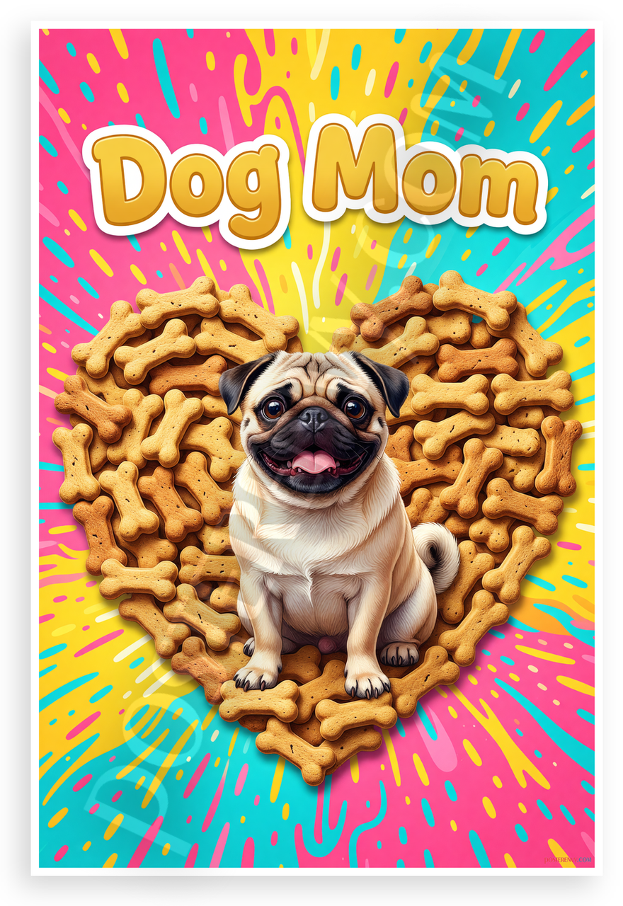 - Playful Pet Design: Adorable Pug centered in a heart of dog bone treats with bold Dog Mom text on vibrant pink yellow blue splash background ideal for kitchens nurseries pet rooms