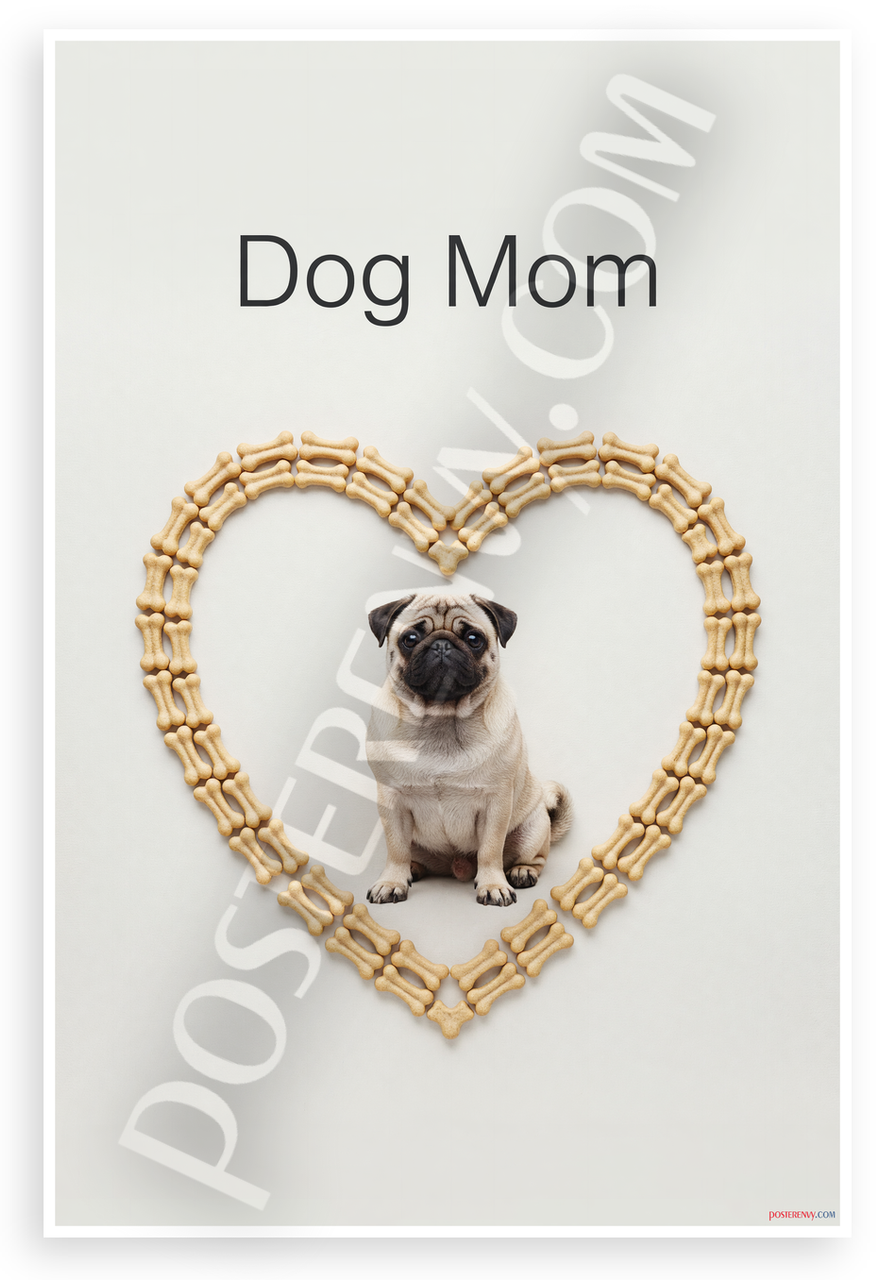 This 12x18 inch poster is printed on premium, durable paper. Proudly Made in the USA by PosterEnvy. The perfect size for any room. PosterEnvy is a family owned business, delivering top-notch posters around the world for over 20 years. Our posters are designed to last — they won't fade or pucker for years of enjoyment. Every poster features crisp, vivid artwork. We are a solar powered company. This elegant minimalist design features 'Dog Mom' text above a cute Pug centered in a heart frame made of dog bone treats, evoking a serene and affectionate mood for pet lovers.