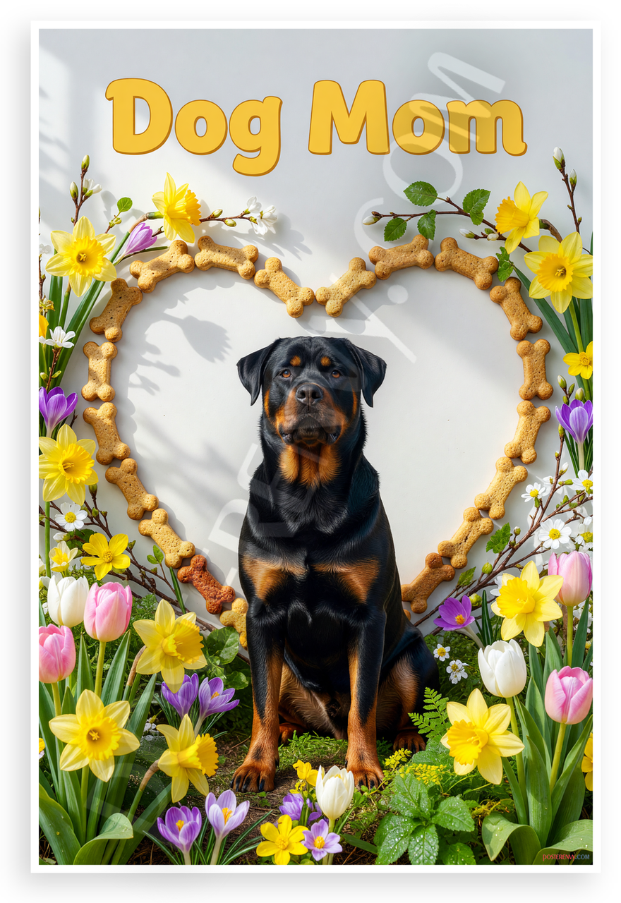 This 12x18 inch poster is printed on premium, durable paper. Proudly Made in the USA by PosterEnvy. The perfect size for any room. PosterEnvy is a family owned business, delivering top-notch posters around the world for over 20 years. Our posters are designed to last — they won't fade or pucker for years of enjoyment. Every poster features crisp, vivid artwork. We are a solar powered company. Celebrate the special bond with this lively Rottweiler framed in a heart of dog bone treats, surrounded by vibrant spring flowers like daffodils, tulips, and crocuses. 'Dog Mom' text adds a fun, heartfelt touch.