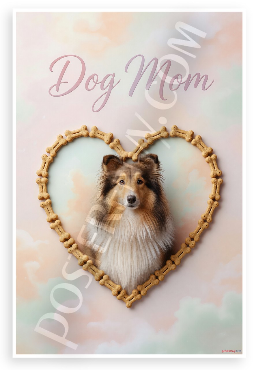 - Heartwarming Dog Design: Elegant Shetland Sheepdog portrait inside a heart frame of tiny bone treats on soft pastel cloudy background with Dog Mom text. Calm loving vibe perfect for kitchens, living rooms, pet rooms or nurseries