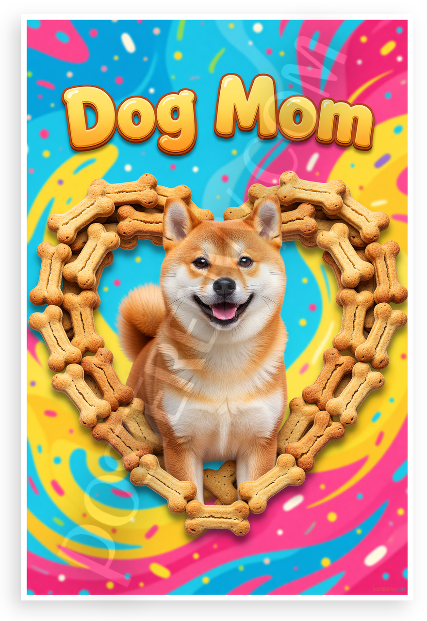 This 12x18 inch poster is printed on premium, durable paper. Proudly Made in the USA by PosterEnvy. The perfect size for any room. PosterEnvy is a family owned business, delivering top-notch posters around the world for over 20 years. Our posters are designed to last — they won't fade or pucker for years of enjoyment. Every poster features crisp, vivid artwork. We are a solar powered company. This vibrant poster showcases a cute Shiba Inu dog inside a heart frame of dog bone treats with bold Dog Mom text, perfect for dog lovers. Its playful swirly background in bright colors brings joy to any space.