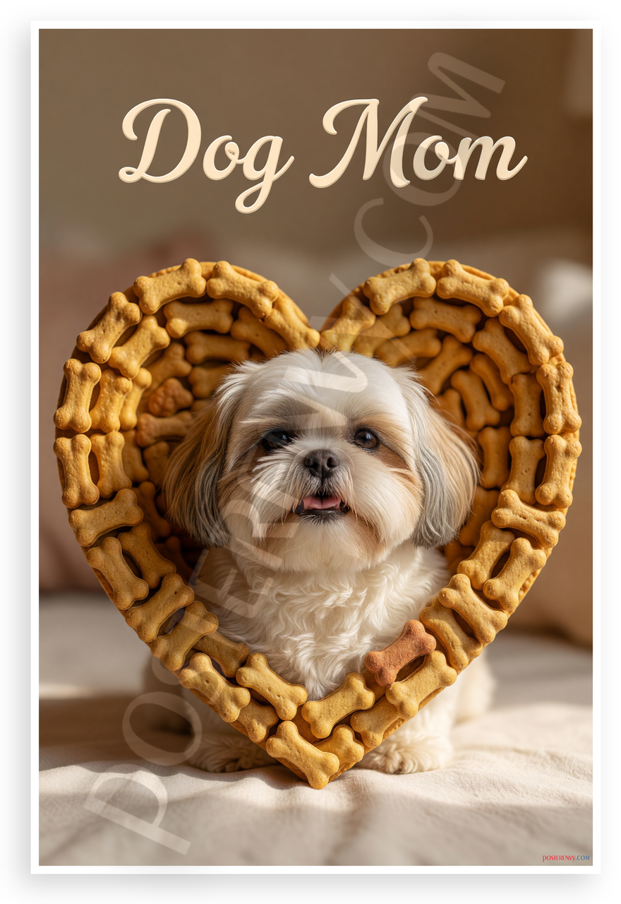 This 12x18 inch poster is printed on premium, durable paper. Proudly Made in the USA by PosterEnvy. The perfect size for any room. PosterEnvy is a family owned business, delivering top-notch posters around the world for over 20 years. Our posters are designed to last — they won't fade or pucker for years of enjoyment. Every poster features crisp, vivid artwork. We are a solar powered company. Features an adorable Shih Tzu dog framed in a heart of tiny bone-shaped treats with 'Dog Mom' text in a warm, affectionate style perfect for pet lovers.
