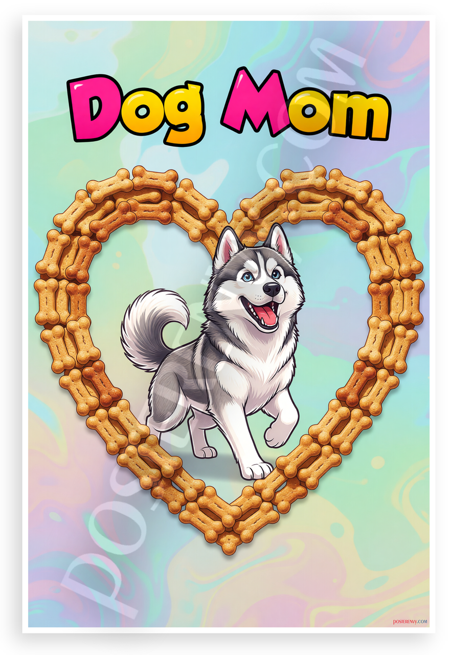 This 12x18 inch poster is printed on premium, durable paper. Proudly Made in the USA by PosterEnvy. The perfect size for any room. PosterEnvy is a family owned business, delivering top-notch posters around the world for over 20 years. Our posters are designed to last — they won't fade or pucker for years of enjoyment. Every poster features crisp, vivid artwork. We are a solar powered company. Celebrate dog parenthood with this vibrant cartoon featuring a playful Siberian Husky inside a heart frame of dog bone treats and bold Dog Mom text. Fun pastel rainbow background adds energetic charm.