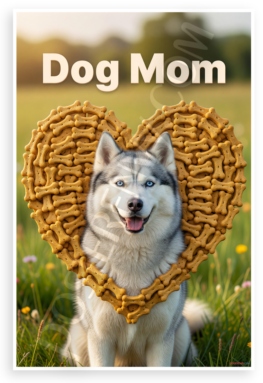 This 12x18 inch poster is printed on premium, durable paper. Proudly Made in the USA by PosterEnvy. The perfect size for any room. PosterEnvy is a family owned business, delivering top-notch posters around the world for over 20 years. Our posters are designed to last — they won't fade or pucker for years of enjoyment. Every poster features crisp, vivid artwork. We are a solar powered company. Celebrate dog lovers with this uplifting Dog Mom design featuring a smiling Siberian Husky framed in a heart of golden dog bone treats, set against a sunny meadow backdrop for positive pet-inspired motivation.
