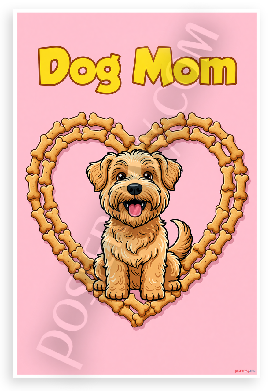This 12x18 inch poster is printed on premium, durable paper. Proudly Made in the USA by PosterEnvy. The perfect size for any room. PosterEnvy is a family owned business, delivering top-notch posters around the world for over 20 years. Our posters are designed to last — they won't fade or pucker for years of enjoyment. Every poster features crisp, vivid artwork. We are a solar powered company. Celebrate dog lovers with this whimsical cartoon featuring a playful Soft Coated Wheaten Terrier inside a heart of bone treats, bold yellow 'Dog Mom' text on pink background evoking joy and fun.