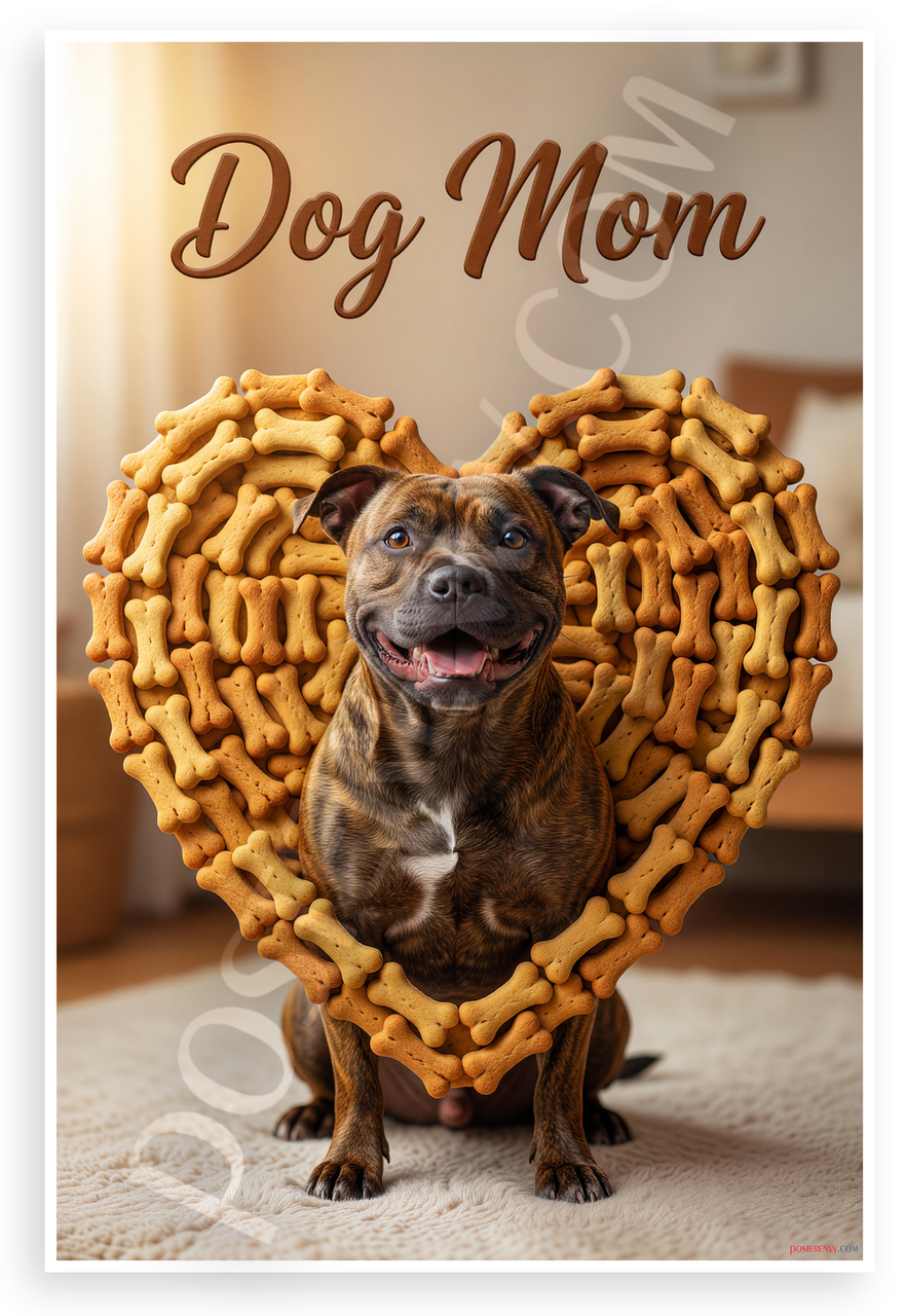 This 12x18 inch poster is printed on premium, durable paper. Proudly Made in the USA by PosterEnvy. The perfect size for any room. PosterEnvy is a family owned business, delivering top-notch posters around the world for over 20 years. Our posters are designed to last — they won't fade or pucker for years of enjoyment. Every poster features crisp, vivid artwork. We are a solar powered company. This uplifting poster showcases a smiling Staffordshire Bull Terrier framed in a heart of golden dog bone treats with Dog Mom text, perfect for pet lovers. Warm beige tones and joyful mood brighten any space.
