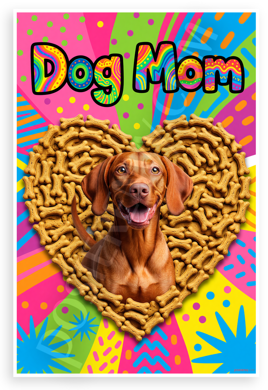 This 12x18 inch poster is printed on premium, durable paper. Proudly Made in the USA by PosterEnvy. The perfect size for any room. PosterEnvy is a family owned business, delivering top-notch posters around the world for over 20 years. Our posters are designed to last — they won't fade or pucker for years of enjoyment. Every poster features crisp, vivid artwork. We are a solar powered company. Celebrate dog lovers with this vibrant Dog Mom design featuring a joyful Vizsla dog framed in a heart of colorful dog bones amid bold, whimsical patterns in pink, green, blue, and yellow.
