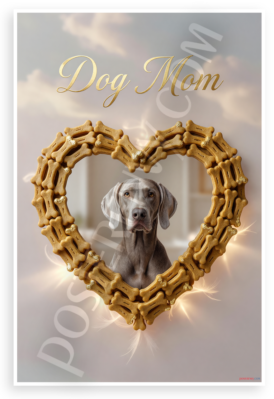 This 12x18 inch poster is printed on premium, durable paper. Proudly Made in the USA by PosterEnvy. The perfect size for any room. PosterEnvy is a family owned business, delivering top-notch posters around the world for over 20 years. Our posters are designed to last — they won't fade or pucker for years of enjoyment. Every poster features crisp, vivid artwork. We are a solar powered company. This elegant poster showcases 'Dog Mom' text with a Weimaraner dog framed in a glowing heart of golden dog bones, evoking timeless affection and sophistication. The soft ethereal mood with gold accents adds a luxurious touch to pet lover decor.