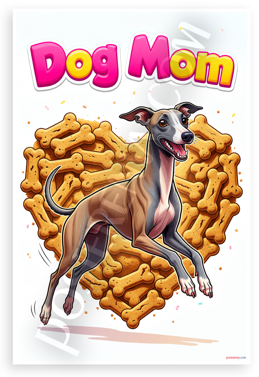 - Playful Pet Design: Energetic Whippet dog leaping in heart-shaped dog bone treats with pink Dog Mom lettering. Fun, bright mood ideal for kitchens, home offices, or pet rooms