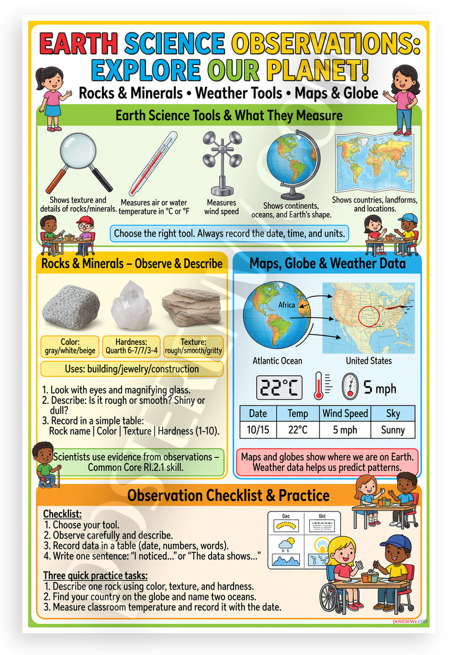 - Engaging Classroom Design: Bright cartoon-style infographic with diverse kids using tools, labeled rocks like granite quartz sandstone, weather stations, globes, maps, and checklists to teach observation skills. Ideal for elementary science classrooms, homeschool, or study areas