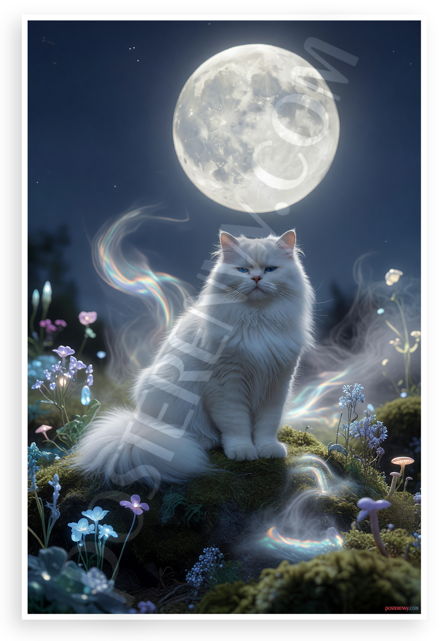 - Mystical Cat Scene: Graceful white Persian cat gazes under luminous full moon amid blue flowers, mushrooms and swirling ethereal auras on mossy ground, creating serene enchanted mood. Ideal for bedroom, living room or fantasy nook