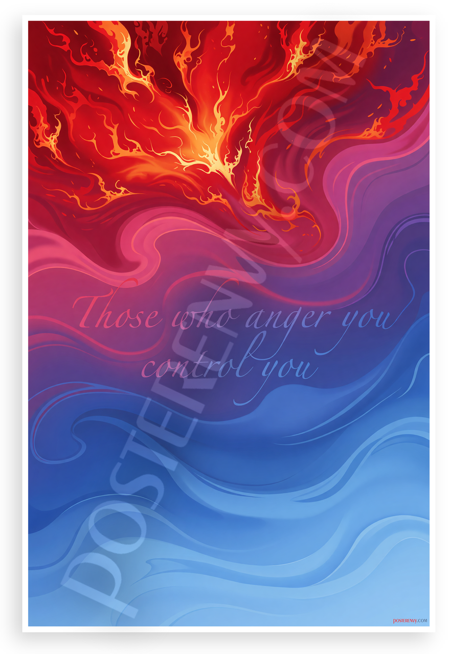 This 12x18 inch poster is printed on premium, durable paper. Proudly Made in the USA by PosterEnvy. The perfect size for any room. PosterEnvy is a family owned business, delivering top-notch posters around the world for over 20 years. Our posters are designed to last — they won't fade or pucker for years of enjoyment. Every poster features crisp, vivid artwork. We are a solar powered company. This striking abstract design transitions from fiery red flames symbolizing chaos and anger at the top to serene blue waves of calm at the bottom, with Elizabeth Kenny's powerful quote elegantly integrated to inspire emotional control and inner peace.