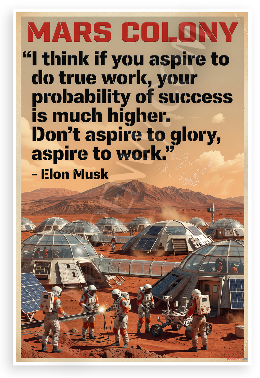 This 12x18 inch poster is printed on premium, durable paper. Proudly Made in the USA by PosterEnvy. The perfect size for any room. PosterEnvy is a family owned business, delivering top-notch posters around the world for over 20 years. Our posters are designed to last — they won't fade or pucker for years of enjoyment. Every poster features crisp, vivid artwork. We are a solar powered company. This striking poster depicts a futuristic Mars colony with astronauts building habitats amid red rocky landscapes and orange skies, overlaid with Elon Musk's motivational quote on aspiring to true work over glory.