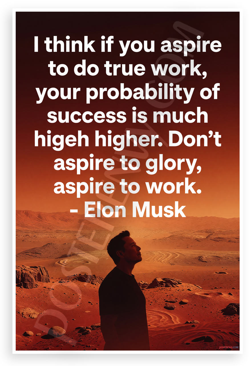 This 12x18 inch poster is printed on premium, durable paper. Proudly Made in the USA by PosterEnvy. The perfect size for any room. PosterEnvy is a family owned business, delivering top-notch posters around the world for over 20 years. Our posters are designed to last — they won't fade or pucker for years of enjoyment. Every poster features crisp, vivid artwork. We are a solar powered company. Featuring Elon Musk's motivational quote 'I think if you aspire to do true work, your probability of success is much higher. Don't aspire to glory, aspire to work.' over a dramatic Mars landscape with a subtle silhouette, in bold empowering style with fiery red tones.
