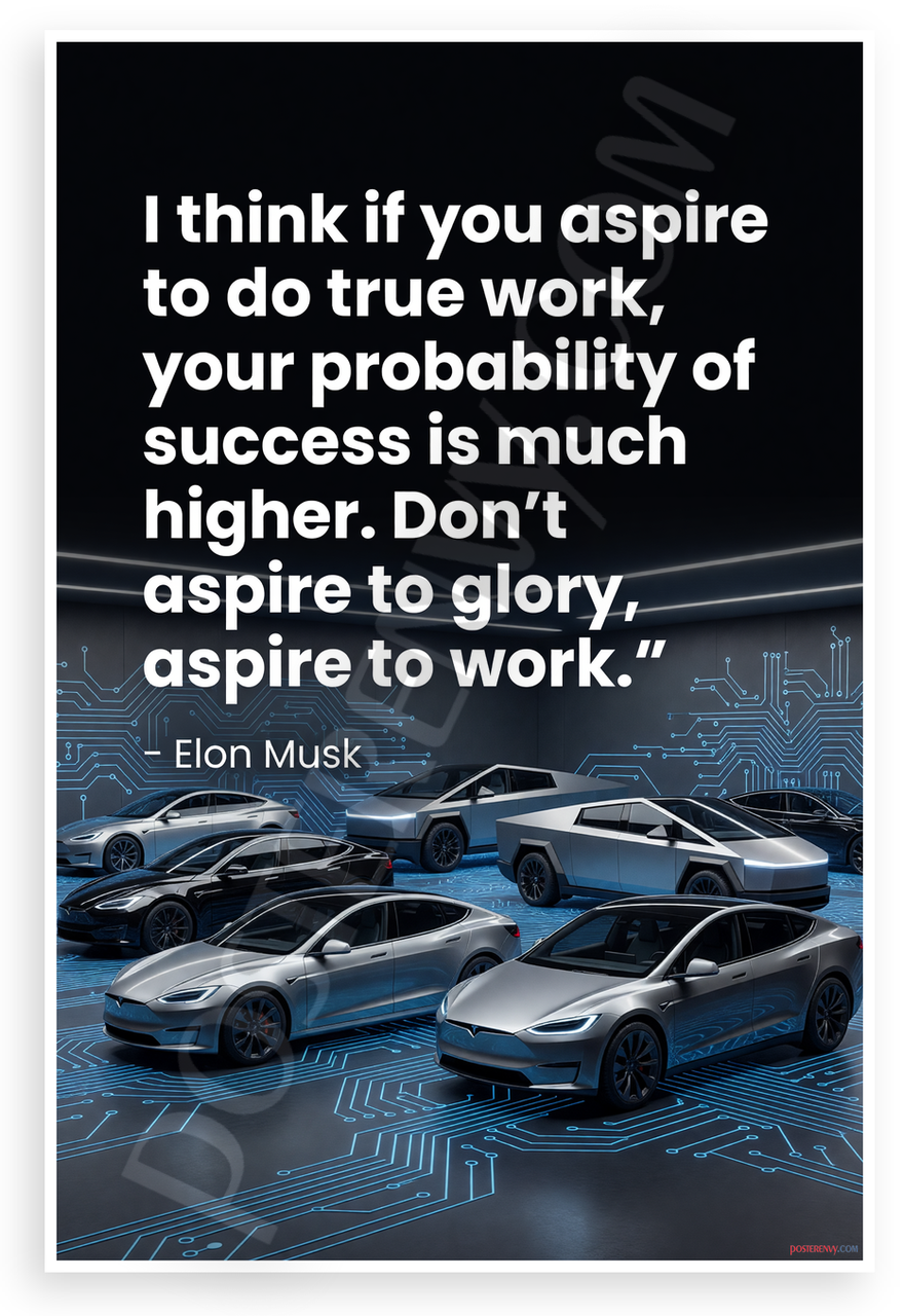 This 12x18 inch poster is printed on premium, durable paper. Proudly Made in the USA by PosterEnvy. The perfect size for any room. PosterEnvy is a family owned business, delivering top-notch posters around the world for over 20 years. Our posters are designed to last — they won't fade or pucker for years of enjoyment. Every poster features crisp, vivid artwork. We are a solar powered company. Featuring Elon Musk's motivational quote 'I think if you aspire to do true work, your probability of success is much higher. Don't aspire to glory, aspire to work.' against a dynamic background of sleek Tesla cars, Cybertrucks, and glowing circuit patterns in a modern tech style.