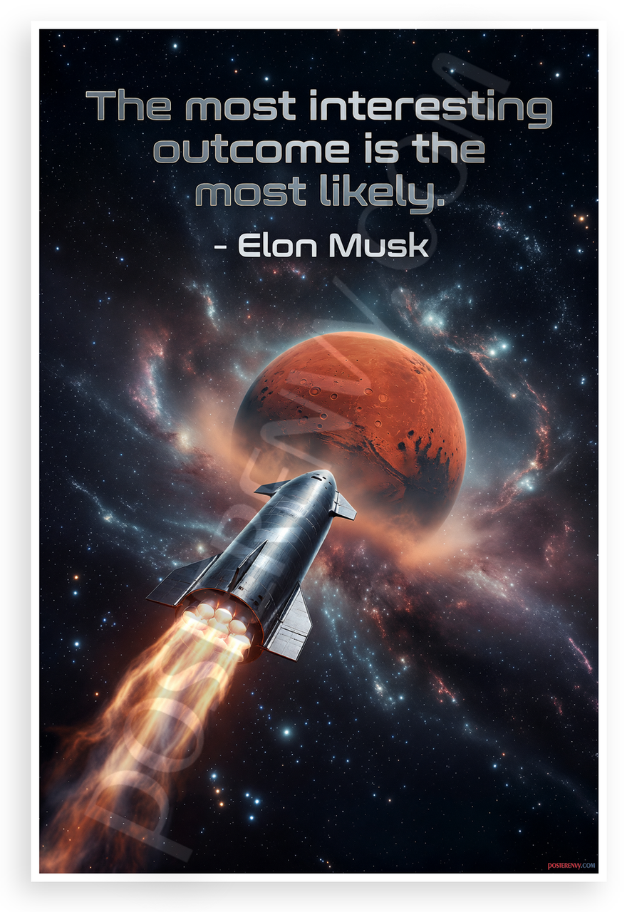 This 12x18 inch poster is printed on premium, durable paper. Proudly Made in the USA by PosterEnvy. The perfect size for any room. PosterEnvy is a family owned business, delivering top-notch posters around the world for over 20 years. Our posters are designed to last — they won't fade or pucker for years of enjoyment. Every poster features crisp, vivid artwork. We are a solar powered company. This striking motivational poster showcases Elon Musk's quote 'The most interesting outcome is the most likely' overlaid on a dramatic scene of a silver rocket launching towards Mars amid starry space and nebulae. The bold silver text contrasts with fiery orange rocket flames, red planet hues, and deep cosmic blues for an inspiring space exploration vibe.