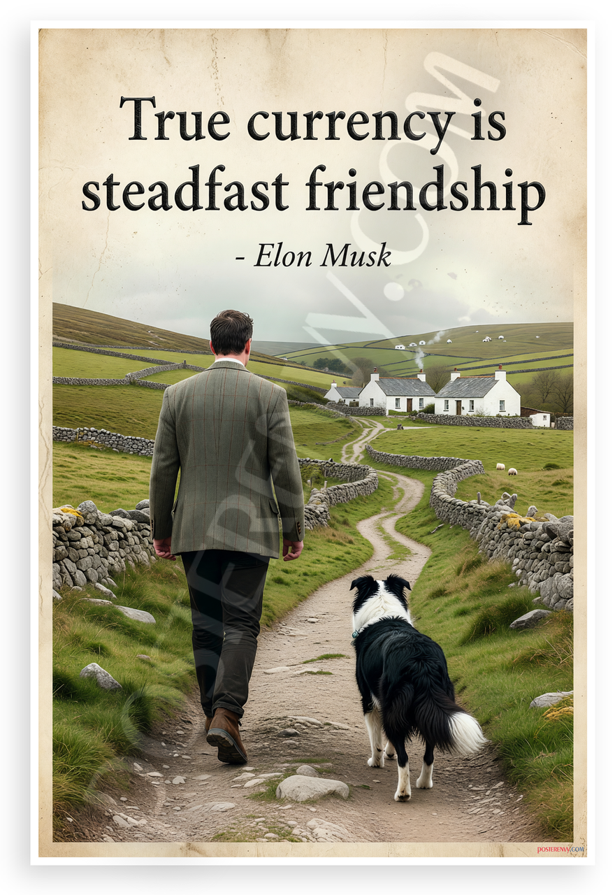 - Inspirational Countryside Scene: Vintage aesthetic with Elon Musk 'True currency is steadfast friendship' quote, man and Border Collie on winding path through green hills, stone walls, white cottages under cloudy sky. Ideal for office, living room, or den to inspire loyalty and adventure