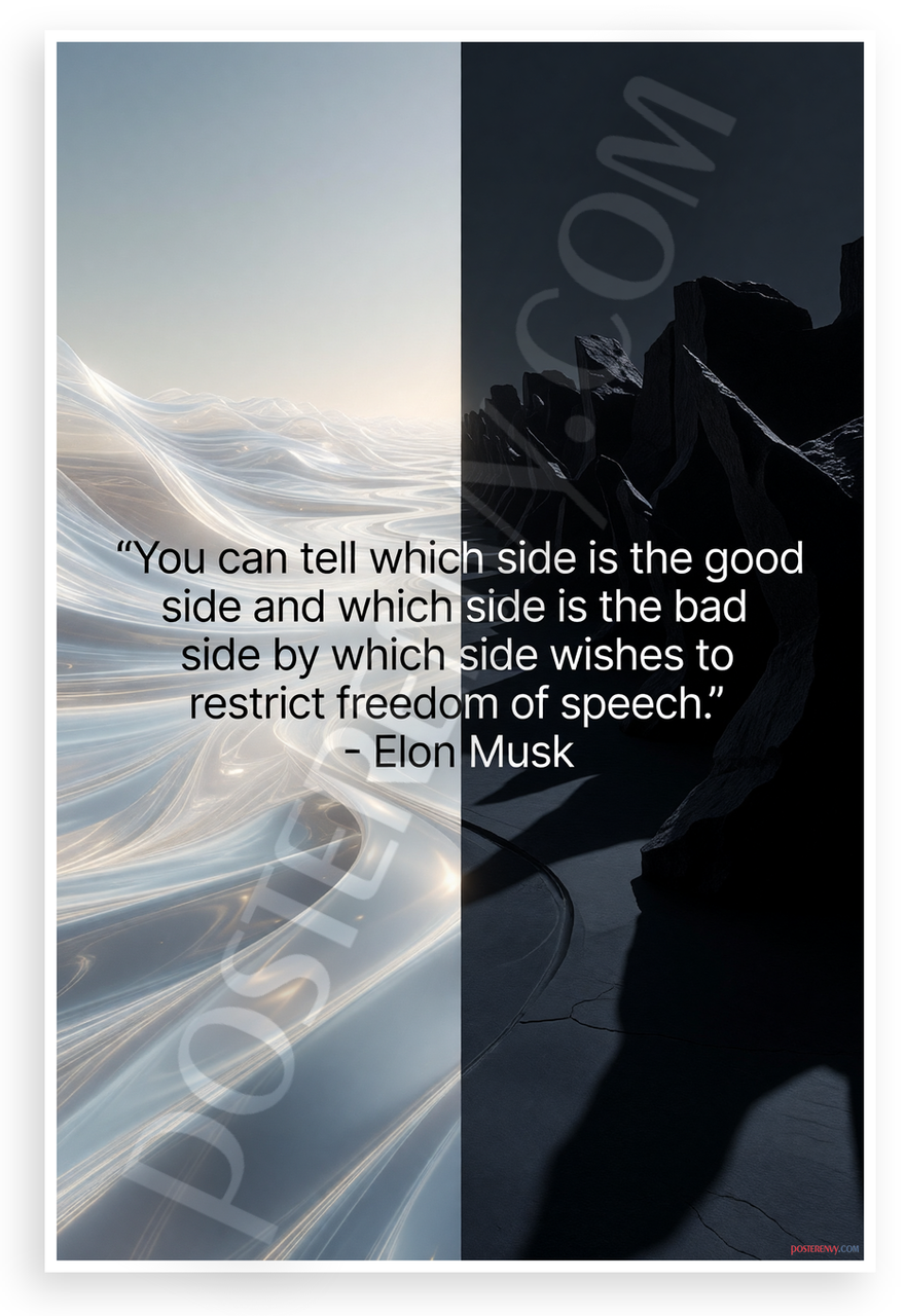This 12x18 inch poster is printed on premium, durable paper. Proudly Made in the USA by PosterEnvy. The perfect size for any room. PosterEnvy is a family owned business, delivering top-notch posters around the world for over 20 years. Our posters are designed to last — they won't fade or pucker for years of enjoyment. Every poster features crisp, vivid artwork. We are a solar powered company. This striking abstract design splits light and dark halves with flowing waves on the bright side contrasting barriers and shadows on the dark, overlaying Elon Musk's provocative quote on freedom of speech for a thought-provoking display.