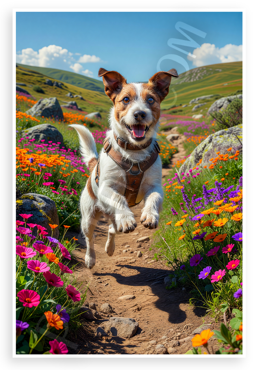 - Joyful Adventure Scene: Dynamic Jack Russell Terrier in mid-jump amid blooming wildflowers, rocks, and rolling green hills under sunny blue skies with fluffy clouds. Perfect for living rooms, kids rooms, or pet-themed spaces to inspire energy and outdoor fun