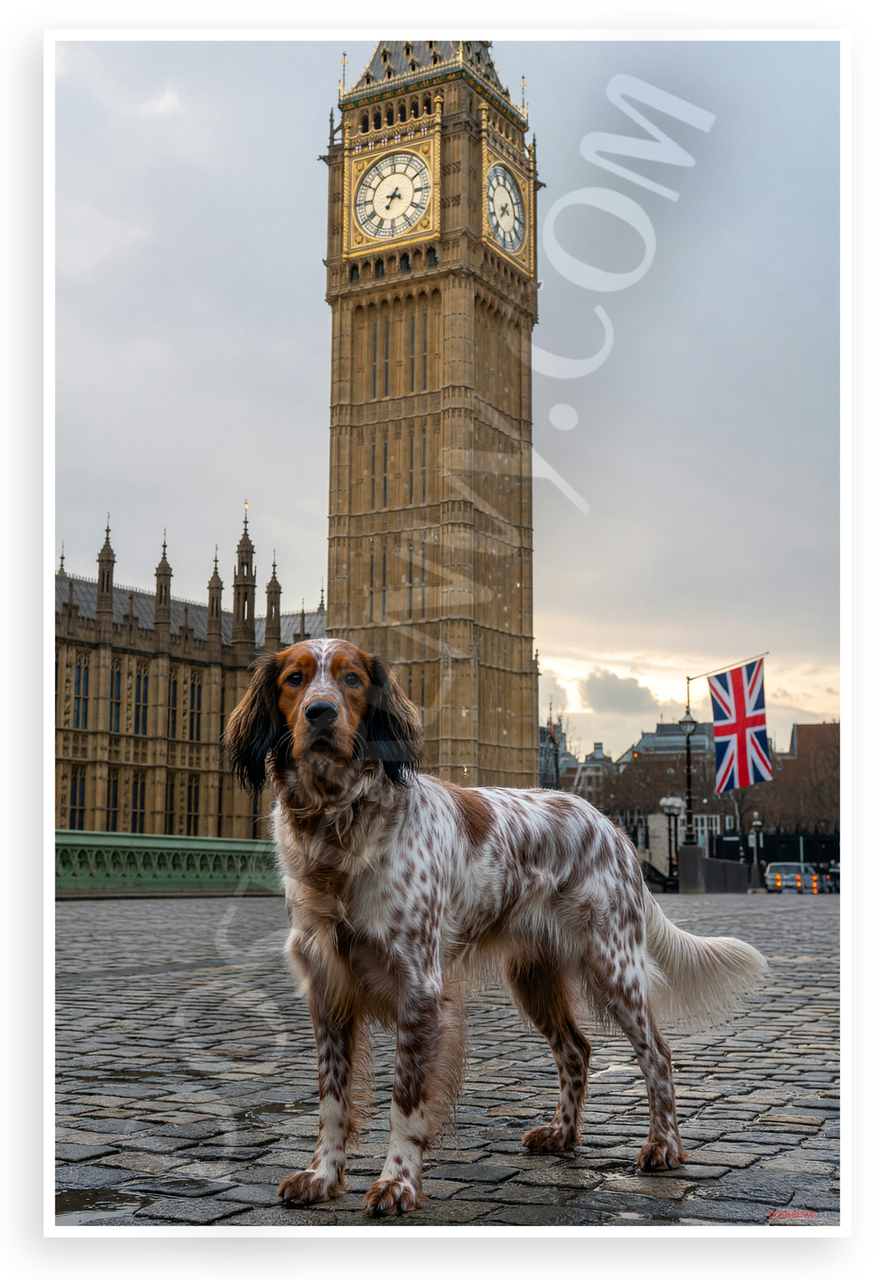 - Iconic British Scene: English Setter gazes at towering Big Ben and Parliament under overcast skies, Union Jack flag adding patriotic touch. Nostalgic mood suits living rooms, offices, or man caves