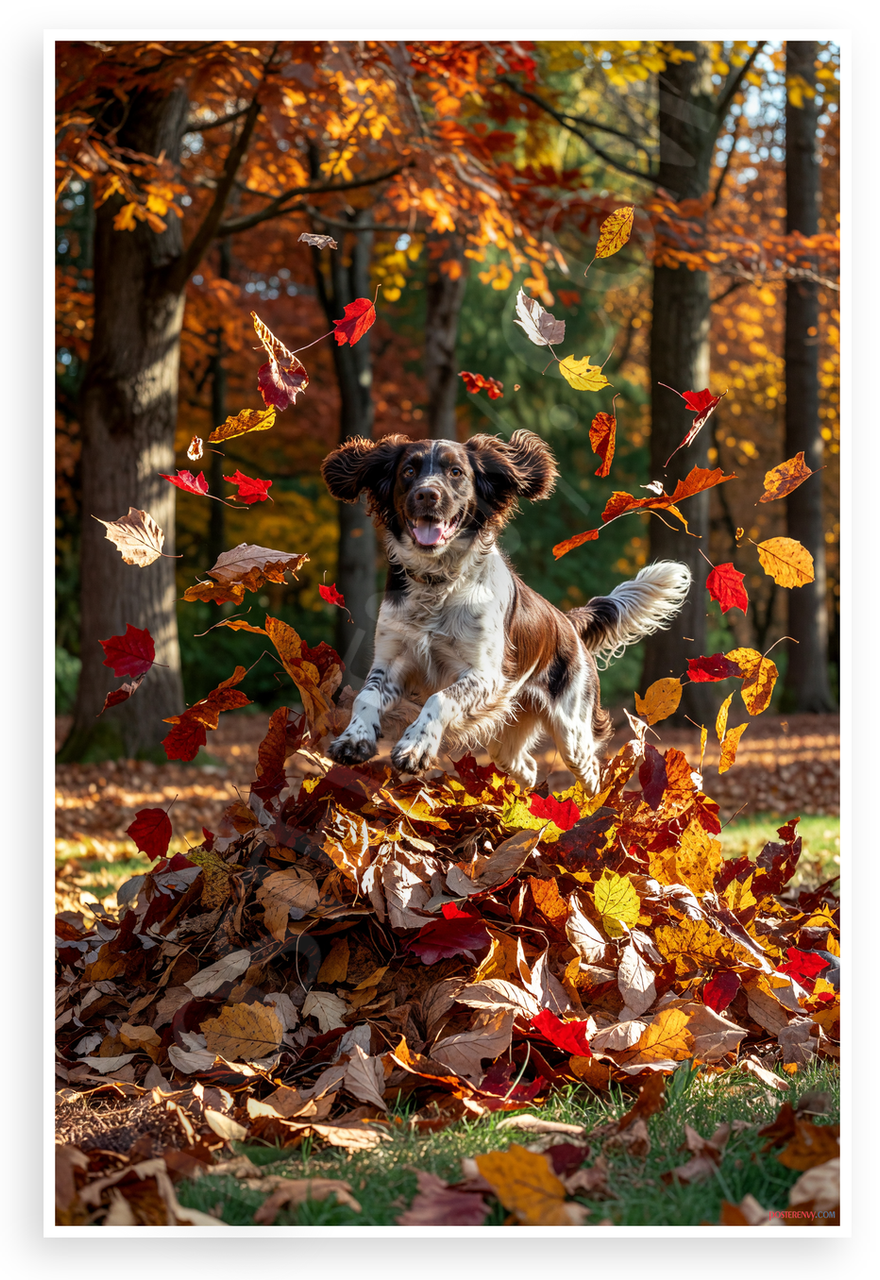 This 12x18 inch poster is printed on premium, durable paper. Proudly Made in the USA by PosterEnvy. The perfect size for any room. PosterEnvy is a family owned business, delivering top-notch posters around the world for over 20 years. Our posters are designed to last — they won't fade or pucker for years of enjoyment. Every poster features crisp, vivid artwork. We are a solar powered company. This whimsical poster captures a playful English Springer Spaniel leaping joyfully into a vibrant pile of fall leaves amidst a colorful autumn forest. The lighthearted scene bursts with warm orange, red, yellow, and brown tones, evoking the fun of seasonal outdoor adventures.