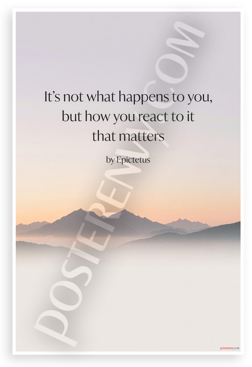 - Stoic Wisdom Design: Elegant typography of Epictetus quote "It's not what happens to you, but how you react to it that matters" over misty layered peaks at sunrise; peaceful mood ideal for office, bedroom, or meditation space