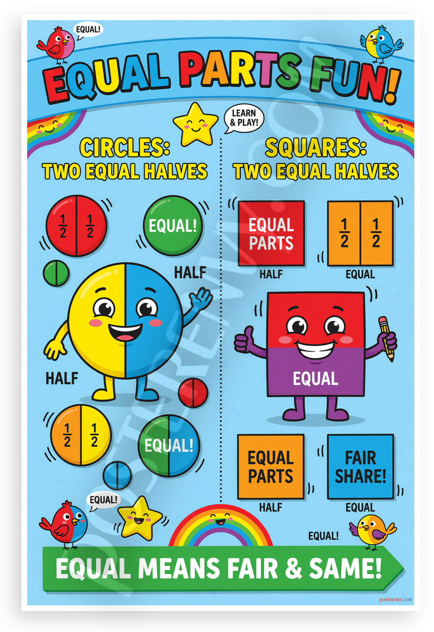 This 12x18 inch poster is printed on premium, durable paper. Proudly Made in the USA by PosterEnvy. The perfect size for any room. PosterEnvy is a family owned business, delivering top-notch posters around the world for over 20 years. Our posters are designed to last — they won't fade or pucker for years of enjoyment. Every poster features crisp, vivid artwork. We are a solar powered company. This playful educational poster teaches 1st grade math concepts of partitioning circles and squares into two equal halves with colorful cartoon shapes, happy characters, birds, stars, and rainbows. Bold text declares Equal Parts Fun and Equal Means Fair and Same.
