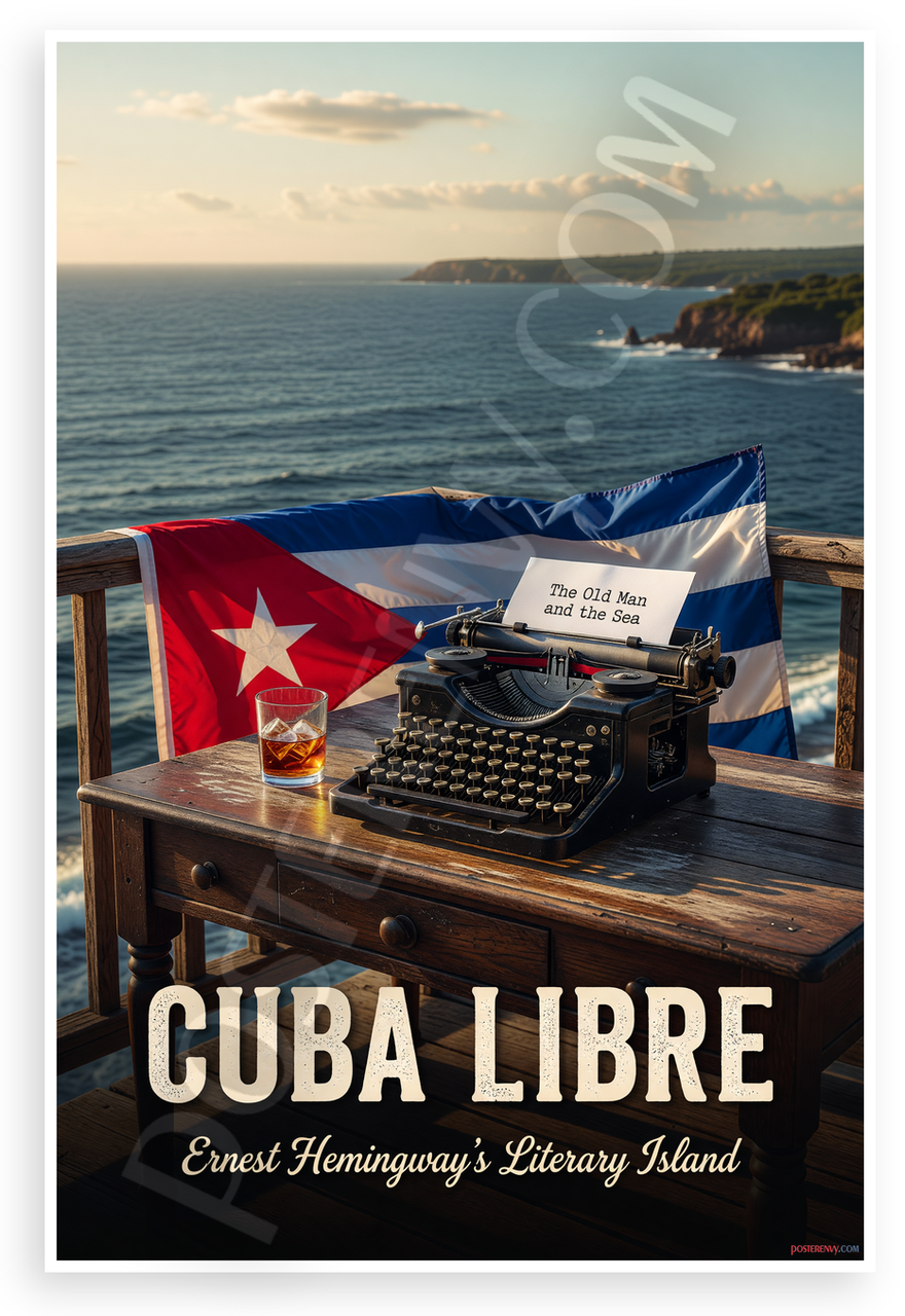 - Literary Cuba Scene: Vintage style captures Hemingway's island with typewriter, The Old Man and the Sea paper, Cuba Libre, flag against dramatic sunset ocean and cliffs; perfect for office, den, or reading nook