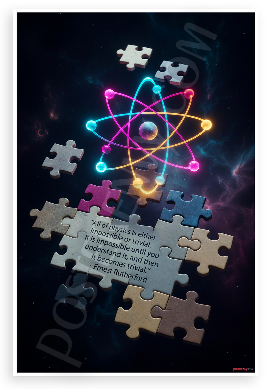 - Dynamic Science Design: Neon-lit atom surrounded by puzzle pieces forming Rutherford's quote on a starry cosmic background, evoking curiosity and breakthrough mood. Perfect for classroom, office, or study