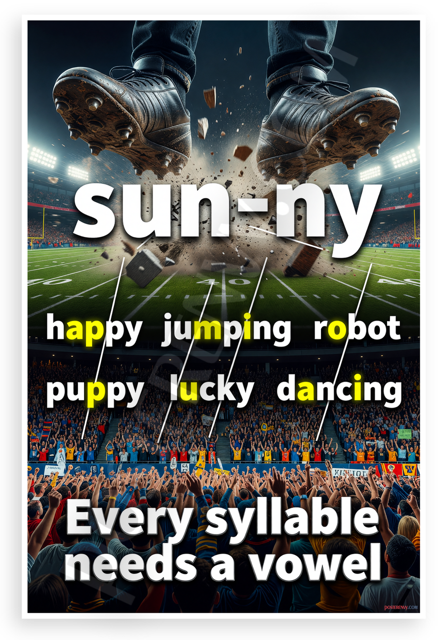 This 12x18 inch poster is printed on premium, durable paper. Proudly Made in the USA by PosterEnvy. The perfect size for any room. PosterEnvy is a family owned business, delivering top-notch posters around the world for over 20 years. Our posters are designed to last — they won't fade or pucker for years of enjoyment. Every poster features crisp, vivid artwork. We are a solar powered company. Dynamic educational design blends football stadium excitement with syllable learning, featuring giant cleats smashing 'sun-ny', vowel-highlighted words like happy jumping robot puppy lucky dancing, and bold 'Every syllable needs a vowel' message amid cheering crowds.