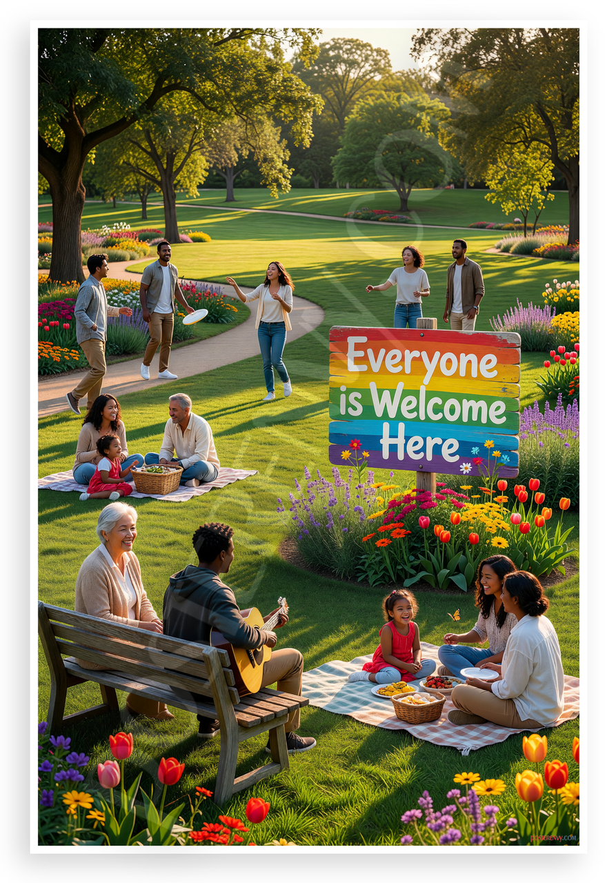 This 12x18 inch poster is printed on premium, durable paper. Proudly Made in the USA by PosterEnvy. The perfect size for any room. PosterEnvy is a family owned business, delivering top-notch posters around the world for over 20 years. Our posters are designed to last — they won't fade or pucker for years of enjoyment. Every poster features crisp, vivid artwork. We are a solar powered company. This inclusive scene depicts a diverse group of people picnicking, walking, and relaxing in a vibrant community park with lush green grass, colorful flowers, and a prominent rainbow sign reading 'Everyone is Welcome Here,' evoking warmth, unity, and togetherness.