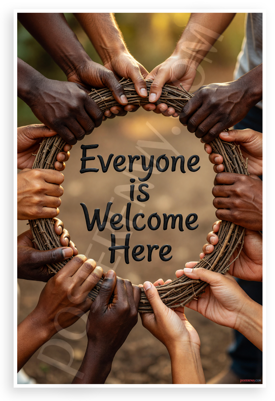 This 12x18 inch poster is printed on premium, durable paper. Proudly Made in the USA by PosterEnvy. The perfect size for any room. PosterEnvy is a family owned business, delivering top-notch posters around the world for over 20 years. Our posters are designed to last — they won't fade or pucker for years of enjoyment. Every poster features crisp, vivid artwork. We are a solar powered company. This uplifting design features diverse hands of various skin tones forming a twig circle around the message 'Everyone is Welcome Here,' set against a warm, golden-hour natural background evoking unity and belonging.