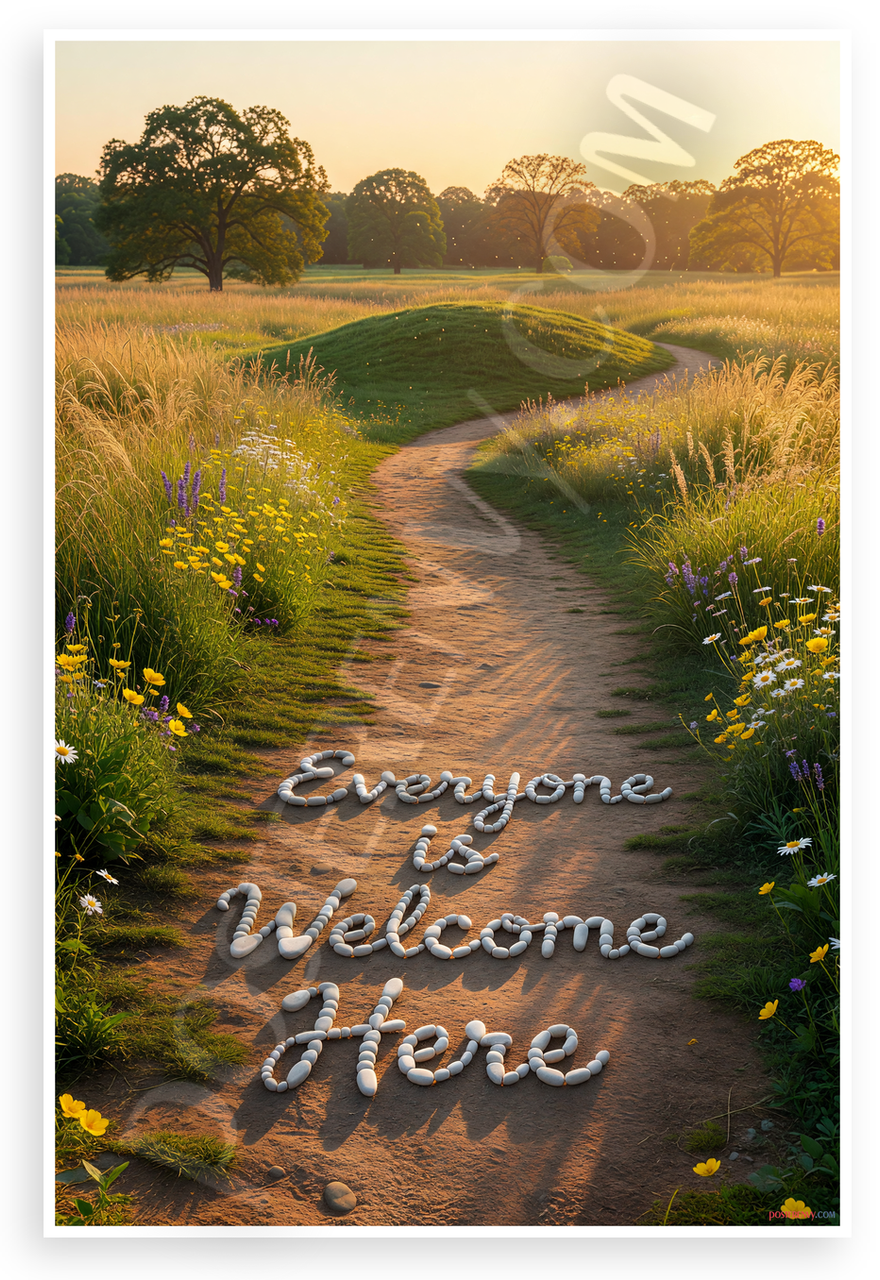This 12x18 inch poster is printed on premium, durable paper. Proudly Made in the USA by PosterEnvy. The perfect size for any room. PosterEnvy is a family owned business, delivering top-notch posters around the world for over 20 years. Our posters are designed to last — they won't fade or pucker for years of enjoyment. Every poster features crisp, vivid artwork. We are a solar powered company. This serene landscape depicts a winding dirt path through golden grasslands and wildflowers, leading toward ancient trees and a grassy mound under a warm sunset sky. The message 'Everyone is Welcome Here' is artistically formed with white stones along the path, evoking tranquility and inclusivity.