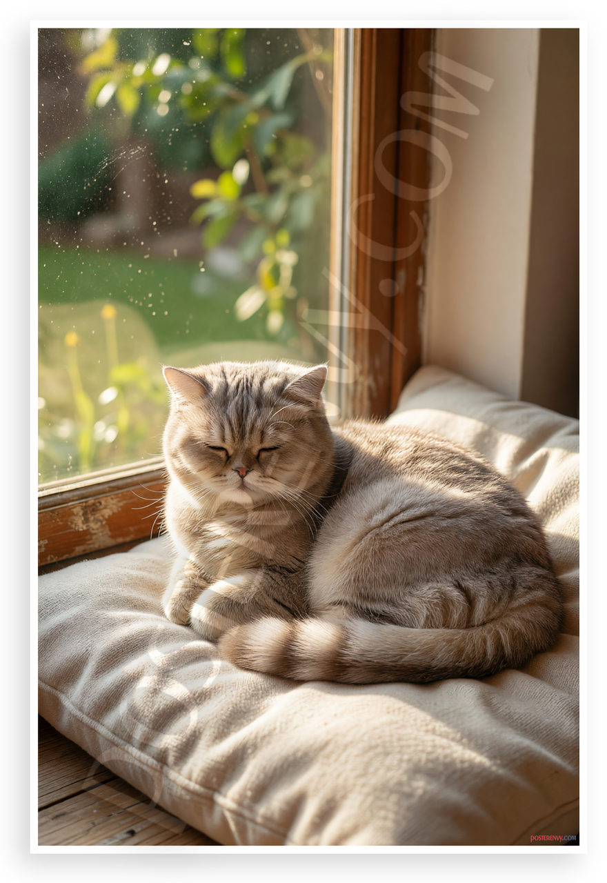 This 12x18 inch poster is printed on premium, durable paper. Proudly Made in the USA by PosterEnvy. The perfect size for any room. PosterEnvy is a family owned business, delivering top-notch posters around the world for over 20 years. Our posters are designed to last — they won't fade or pucker for years of enjoyment. Every poster features crisp, vivid artwork. We are a solar powered company. This cozy scene captures an Exotic Shorthair cat curled up on a cushion by a sunlit window, with soft sunlight filtering through green foliage outside. The warm, peaceful mood evokes relaxation and comfort, ideal for animal lovers.