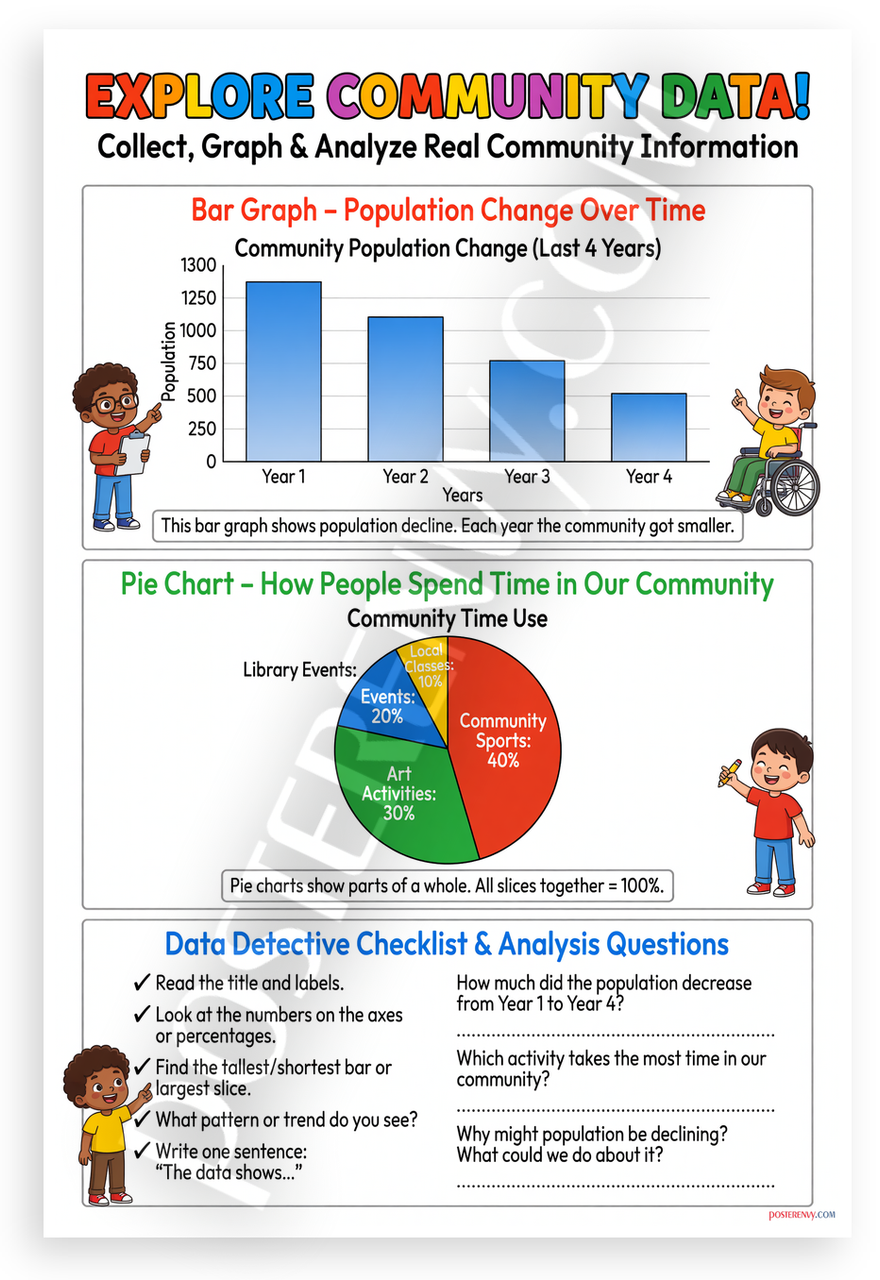 This 12x18 inch poster is printed on premium, durable paper. Proudly Made in the USA by PosterEnvy. The perfect size for any room. PosterEnvy is a family owned business, delivering top-notch posters around the world for over 20 years. Our posters are designed to last — they won't fade or pucker for years of enjoyment. Every poster features crisp, vivid artwork. We are a solar powered company. This vibrant cartoon-style educational poster teaches second graders how to read bar graphs and pie charts using real community data on population decline and time use. Includes data detective checklist and analysis questions with diverse kids pointing at graphs.