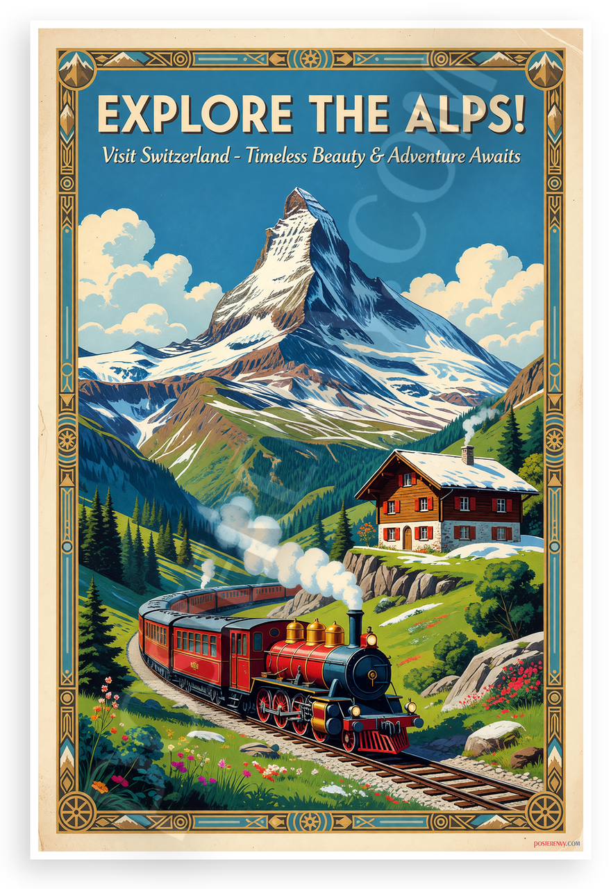 This 12x18 inch poster is printed on premium, durable paper. Proudly Made in the USA by PosterEnvy. The perfect size for any room. PosterEnvy is a family owned business, delivering top-notch posters around the world for over 20 years. Our posters are designed to last — they won't fade or pucker for years of enjoyment. Every poster features crisp, vivid artwork. We are a solar powered company. This vintage-style travel poster showcases the majestic Matterhorn peak, a red steam train winding through green valleys, a Swiss chalet, and bold text 'Explore the Alps! Visit Switzerland - Timeless Beauty & Adventure Awaits'. Evokes adventure and alpine beauty.