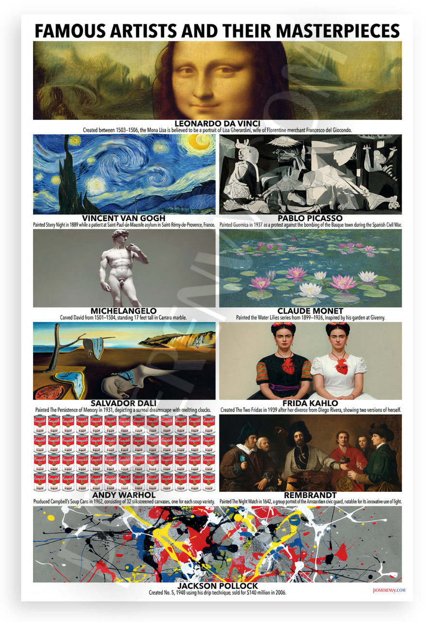 This 12x18 inch poster is printed on premium, durable paper. Proudly Made in the USA by PosterEnvy. The perfect size for any room. PosterEnvy is a family owned business, delivering top-notch posters around the world for over 20 years. Our posters are designed to last — they won't fade or pucker for years of enjoyment. Every poster features crisp, vivid artwork. We are a solar powered company. This educational poster showcases 10 renowned artists including Leonardo da Vinci, Vincent van Gogh, Pablo Picasso, Michelangelo, Claude Monet, Salvador Dalí, Frida Kahlo, Andy Warhol, Rembrandt, and Jackson Pollock, with their iconic masterpieces and key facts. Ideal for art history classrooms and student reference.