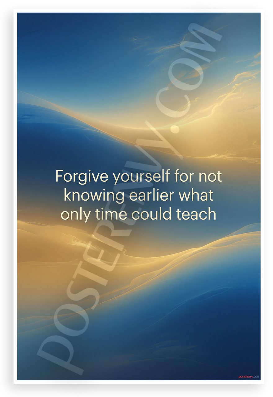 This 12x18 inch poster is printed on premium, durable paper. Proudly Made in the USA by PosterEnvy. The perfect size for any room. PosterEnvy is a family owned business, delivering top-notch posters around the world for over 20 years. Our posters are designed to last — they won't fade or pucker for years of enjoyment. Every poster features crisp, vivid artwork. We are a solar powered company. This abstract design features flowing gradients from deep blue to warm golden hues, evoking time's gentle progression. The elegant quote 'Forgive yourself for not knowing earlier what only time could teach' is integrated seamlessly in modern typography, creating a calming, inspirational mood perfect for reflection.