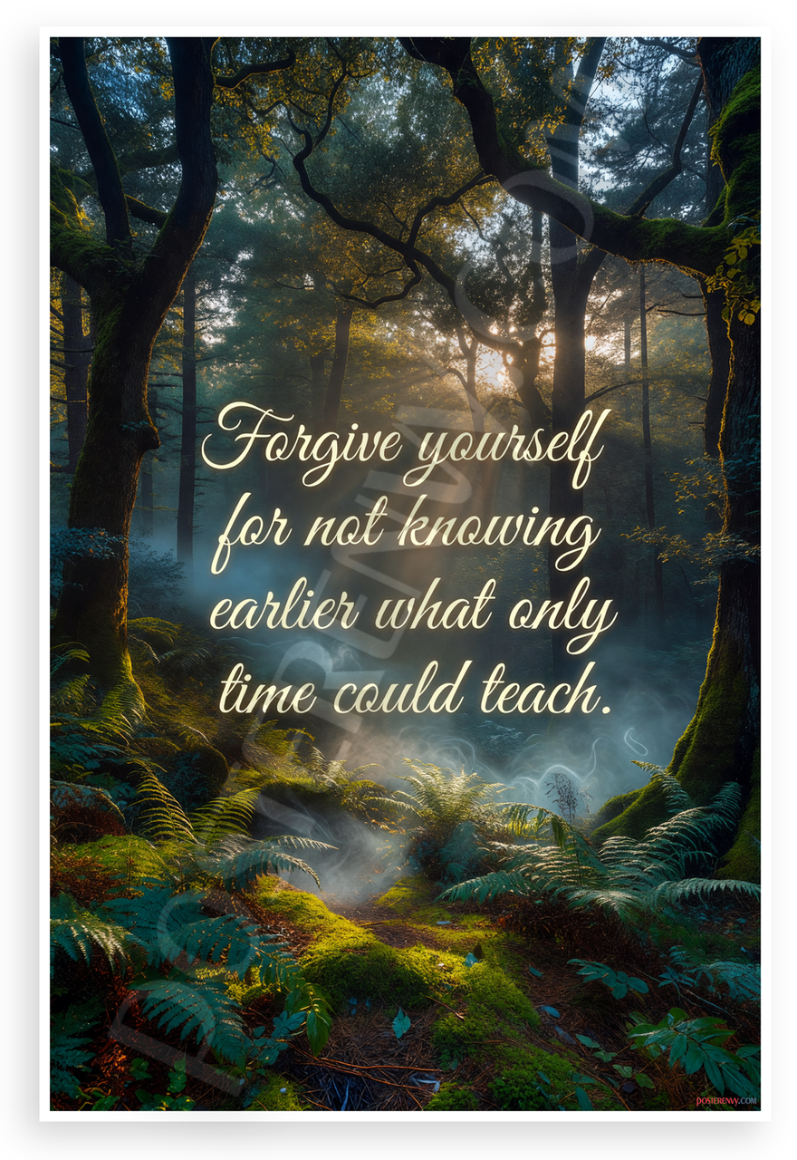 This 12x18 inch poster is printed on premium, durable paper. Proudly Made in the USA by PosterEnvy. The perfect size for any room. PosterEnvy is a family owned business, delivering top-notch posters around the world for over 20 years. Our posters are designed to last — they won't fade or pucker for years of enjoyment. Every poster features crisp, vivid artwork. We are a solar powered company. This serene forest scene at dawn captures sunlight filtering through ancient trees and misty ferns, overlaid with the reflective quote 'Forgive yourself for not knowing earlier what only time could teach' in elegant script, evoking renewal and inner peace.