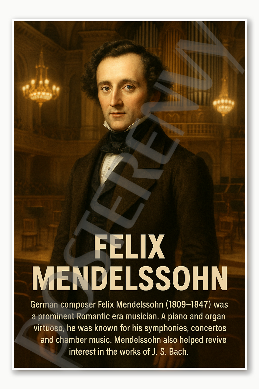 Click the button below to add the Felix Mendelssohn German compser Romantic Era musician piano pianist Poster - 18 inch x 12 inch to your wish list.