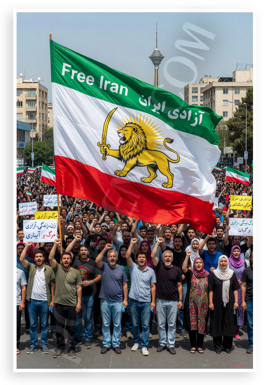 - Dynamic Protest Scene: Vibrant crowd raising Free Iran flags with Lion and Sun emblem against Milad Tower backdrop, conveying passion and unity. Perfect for office, living room or study