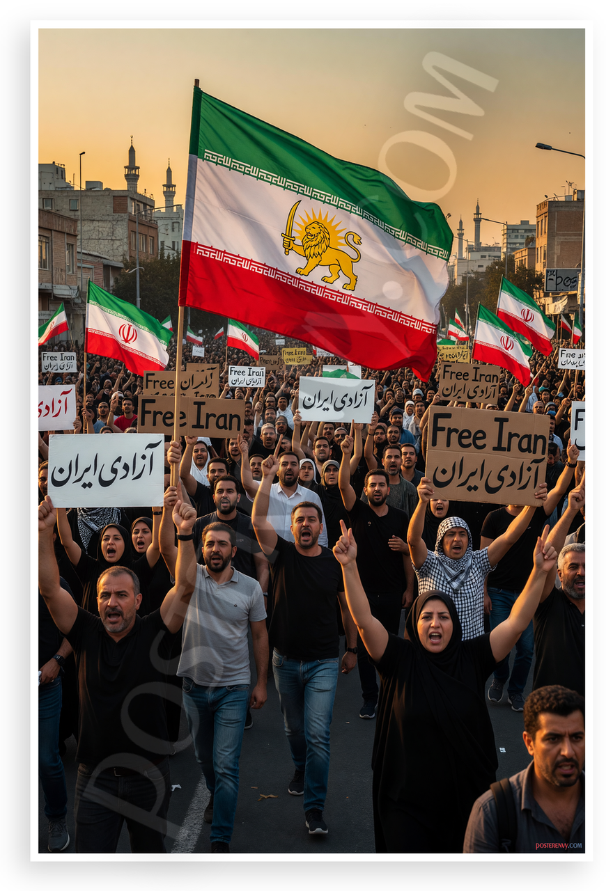 - Dynamic Protest Scene: Energetic crowd waving Iranian Lion and Sun flags, holding Free Iran signs amid cityscape with minarets at golden hour sunset. Ideal for activism spaces, offices, or cultural rooms