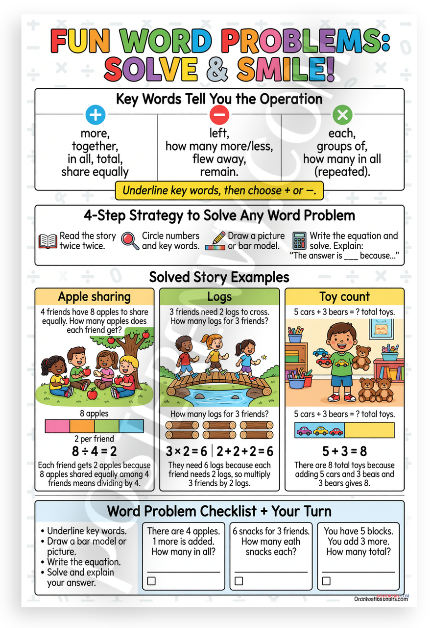 - Engaging Math Lessons: Bright cartoon visuals with apple sharing, log crossing, toy counting examples teach operations, bar models, equations. Cheerful solve & smile theme creates fun classroom mood for elementary rooms, homeschool areas