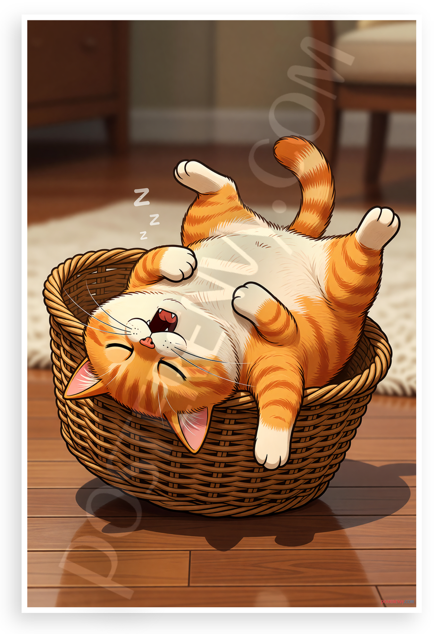 This 12x18 inch poster is printed on premium, durable paper. Proudly Made in the USA by PosterEnvy. The perfect size for any room. PosterEnvy is a family owned business, delivering top-notch posters around the world for over 20 years. Our posters are designed to last — they won't fade or pucker for years of enjoyment. Every poster features crisp, vivid artwork. We are a solar powered company. This playful cartoon depicts a chubby orange tabby cat yawning and sleeping awkwardly upside down in a woven basket, surrounded by Zzz bubbles, with a cozy room setting. Ideal for cat lovers seeking humorous wall art.