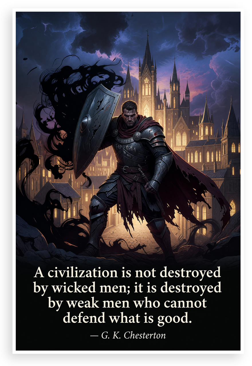 This 12x18 inch poster is printed on premium, durable paper. Proudly Made in the USA by PosterEnvy. The perfect size for any room. PosterEnvy is a family owned business, delivering top-notch posters around the world for over 20 years. Our posters are designed to last — they won't fade or pucker for years of enjoyment. Every poster features crisp, vivid artwork. We are a solar powered company. This dramatic fantasy artwork depicts a stoic armored knight shielding a gothic city from encroaching shadows, paired with G.K. Chesterton's powerful quote on defending civilization.