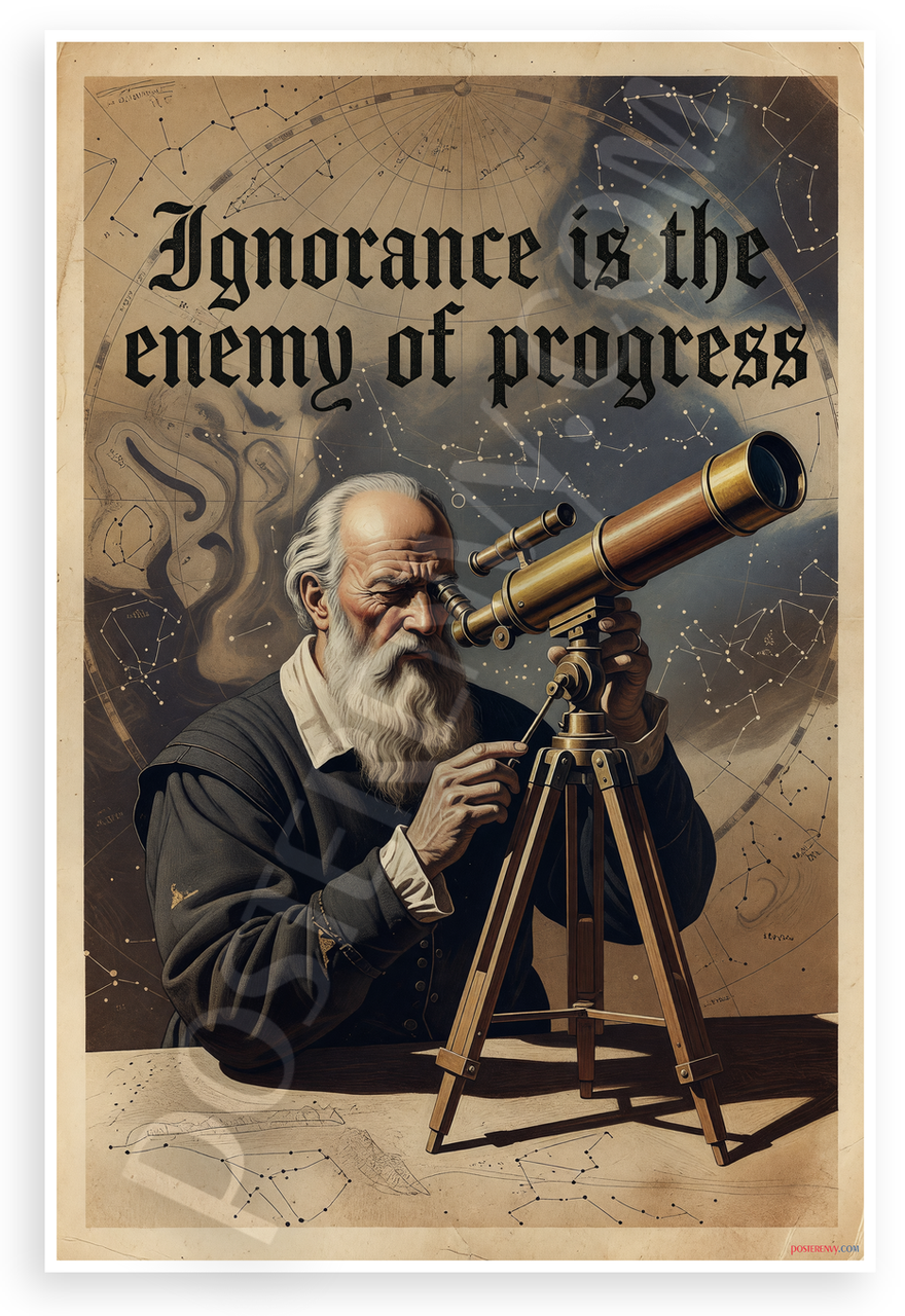 - Historical Astronomy Scene: Vintage illustration of Galileo observing stars through telescope, surrounded by cosmic maps and bold motivational quote on ignorance and progress. Perfect for study, office, or classroom to inspire curiosity and learning